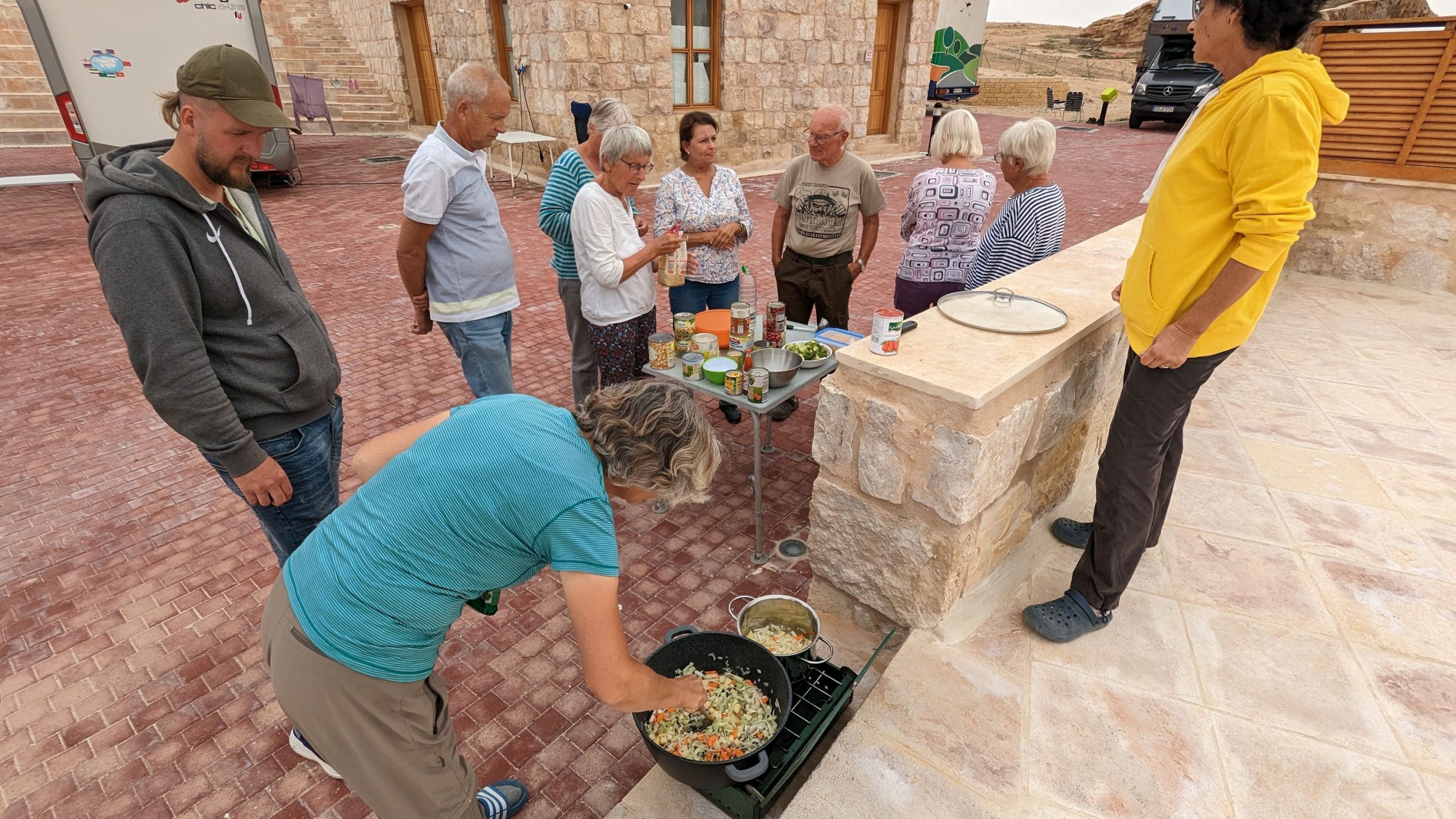 Erstaunlicher Weise schmeckt allen die Suppe sehr gut und alle werden satt. Ute und Roman haben für den Nachtisch Kuchen eingekauft, da sie keine Sachen beisteuern konnten weil ihr Auto in Amman in der Werkstatt steht und auf die Ersatzteile aus Italien wartet. Sie haben sich einen Mietwagen genommen und wohnen in den jeweiligen Orten in Hotels bis das Fahrzeug – hoffentlich bald – wieder fahrbereit ist. Bis 19 Uhr sitzen wir noch alle zusammen auf der Terrasse, dann wird es uns zu kalt und alle verziehen sich ins Auto. Geregnet hat es heute nicht, aber es war zeitweise bewölkt.